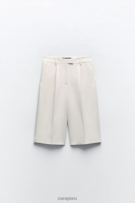 Bermuda de talle alto con trabillas. bolsillos laterales. pliegues delanteros. Cremallera frontal, gancho metálico y cierre interior con botón.