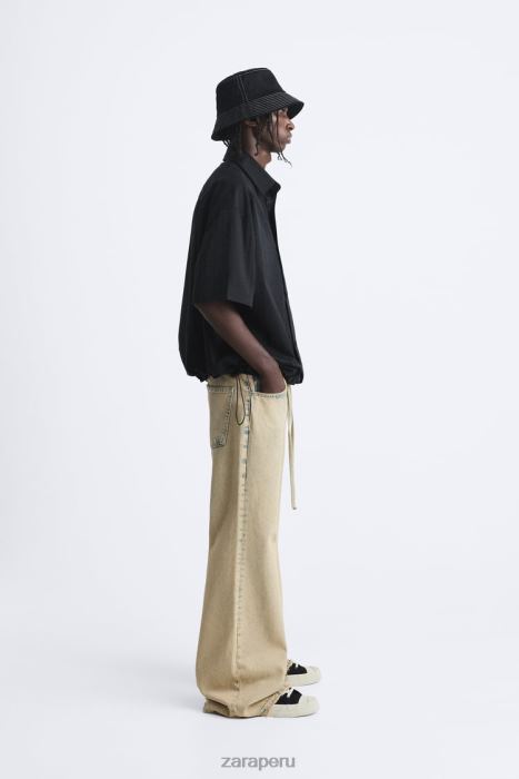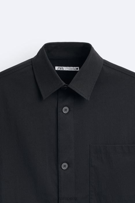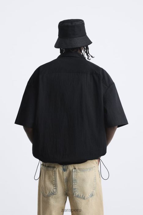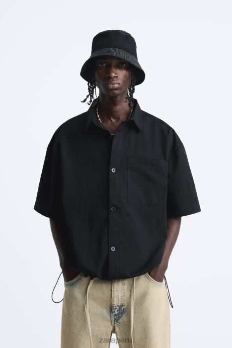 Camisa boxy fit confeccionada en tejido mezcla de algodón. Cuello italiano y manga corta. bolsillo de parche en el pecho. Bajo ajustable con elásticos laterales. cierre de botón frontal.