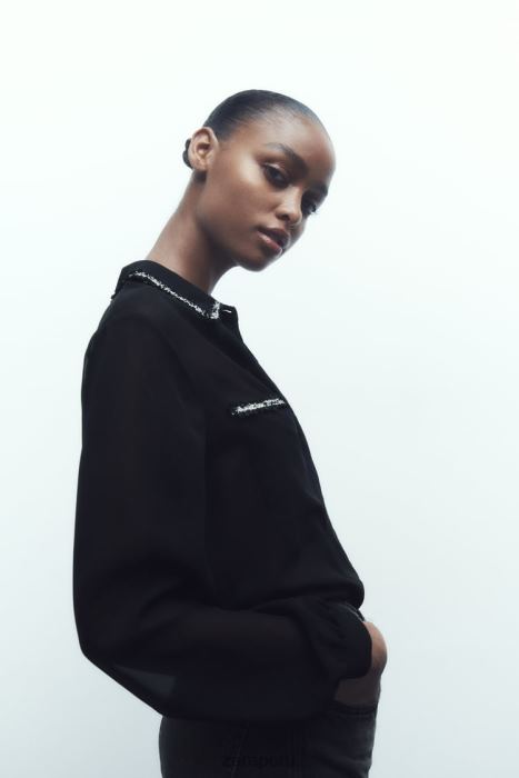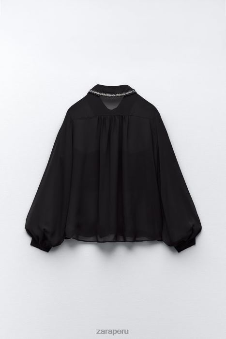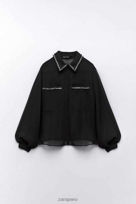 Camisa semitransparente de manga larga y cuello solapa. bolsillos delanteros de parche. ribete texturizado. cierre frontal con botón oculto.este artículo no tiene forro.