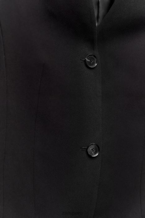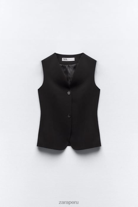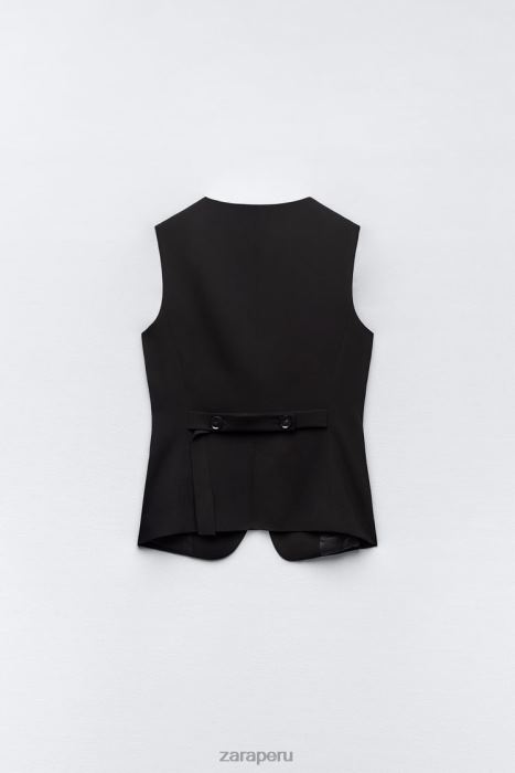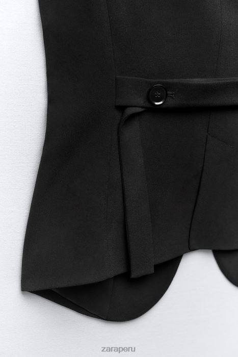 Chaleco entallado con escote en pico. Correa trasera ajustable con botones. Bajo asimétrico con abertura. Forro interior tonal. cierre de botón frontal.