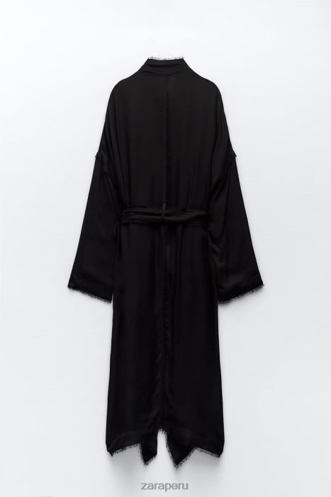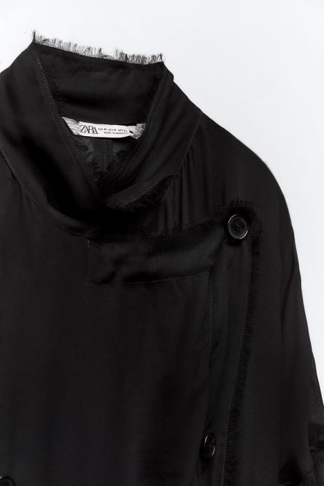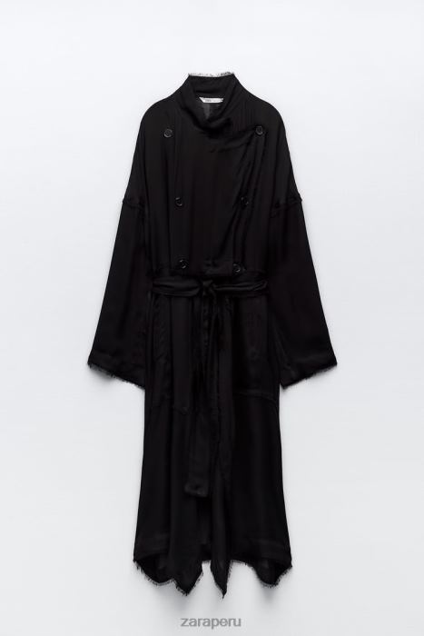 gabardina fluida semitransparente con cuello redondo alto y manga larga acampanada. cinturón atado. bolsillos delanteros. dobladillo asimétrico. ribete deshilachado. Cierre frontal con botones cruzados.