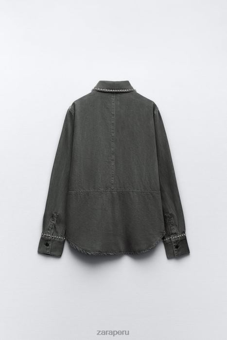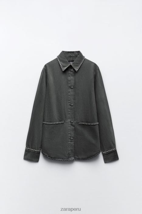 sobrecamisa confeccionada en 100% algodón. cuello solapa y manga larga terminada en puño con botón. Bolsillos delanteros ocultos en las costuras. apliques de joyas. Cierre frontal con botones a presión.