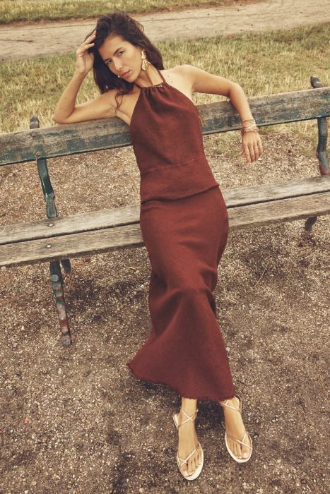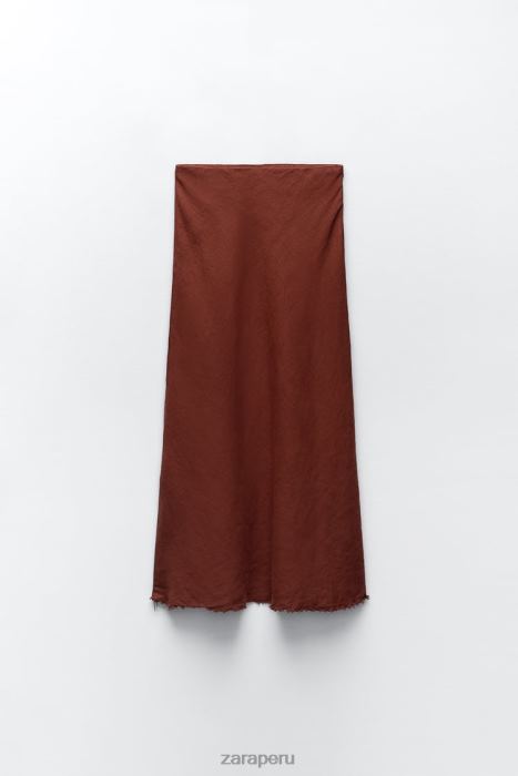 Falda midi confeccionada en 100% lino. a medio levantar. silueta de línea A con dobladillo deshilachado.