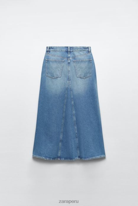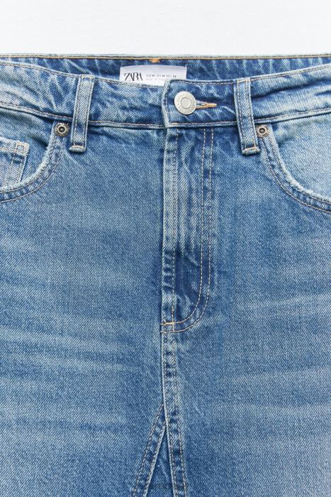 Falda larga de tiro medio con cinco bolsillos. efecto lavado. Cierre frontal con cremallera y botón metálico.
