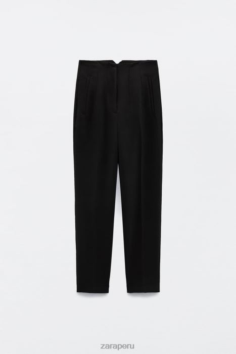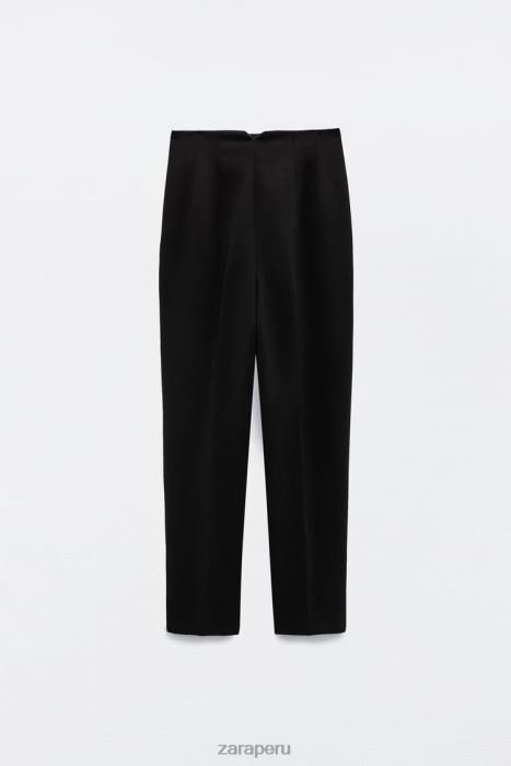 Pantalón de talle alto con costuras pronunciadas en delantero y espalda. bolsillos delanteros ribeteados. Cremallera frontal, gancho metálico y cierre interior con botón.