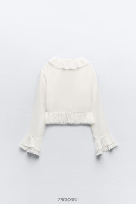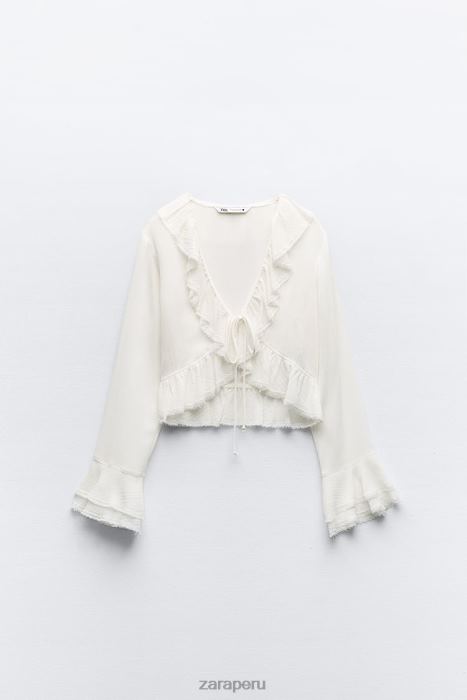 Blusa confeccionada en tejido mixto viscosa. Escote en pico y manga larga con vuelo. Detalle de volante. ribete deshilachado. dobladillo asimétrico. cierre de lazo delantero.