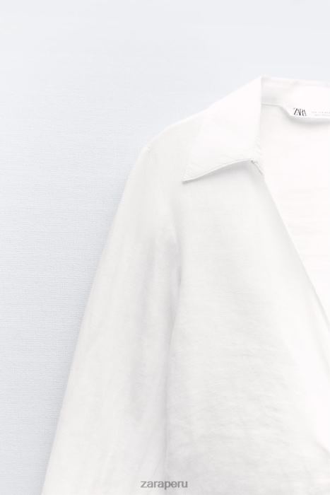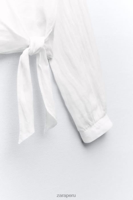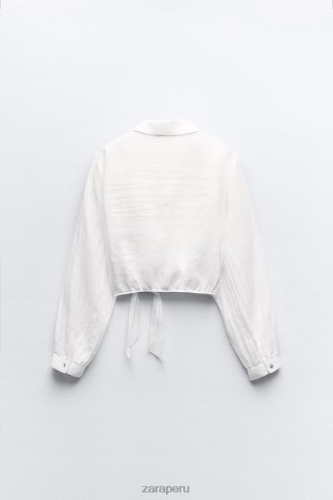 Camisa cropped confeccionada en tejido 100% lino. Cuello solapa en pico y manga larga. dobladillo elástico. cierre frontal con lazo.
