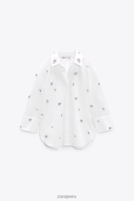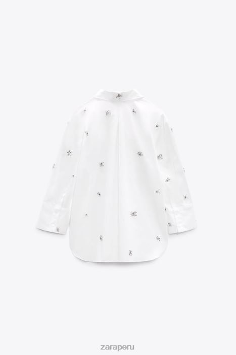 camisa confeccionada en algodón. Cuello solapa en pico y manga por debajo del codo. Apliques de joya y pliegue trasero. Bajo asimétrico con aberturas laterales. cierre de botón frontal.
