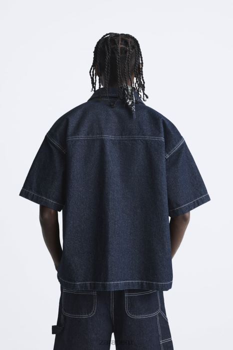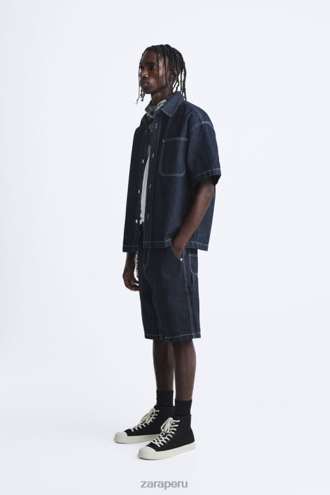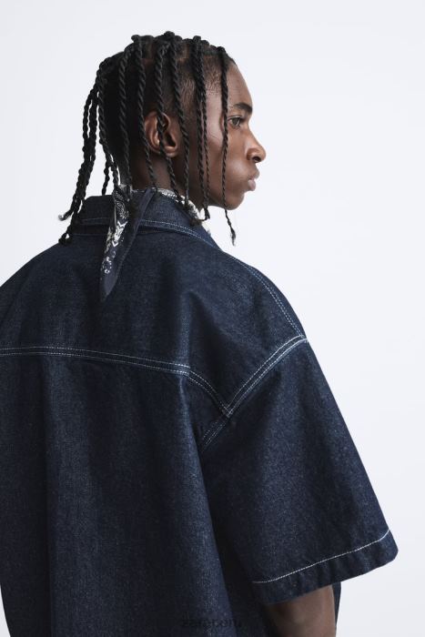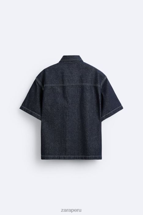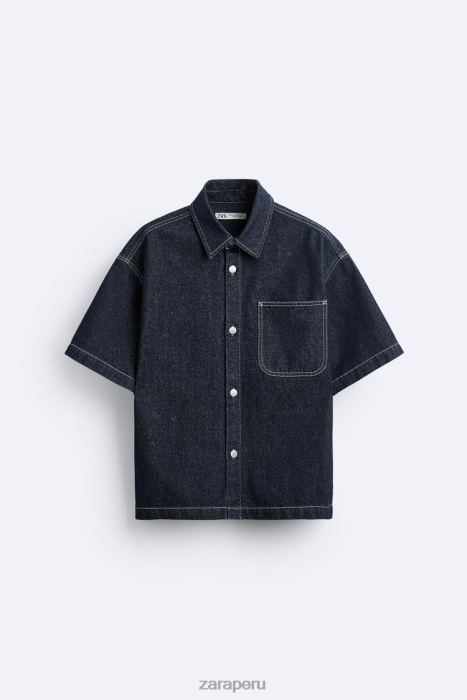 Camisa boxy fit confeccionada en tejido denim compacto. cuello solapa y manga corta. bolsillo de parche en el pecho. Detalles de pespuntes en contraste por toda la prenda. cierre de botón frontal.