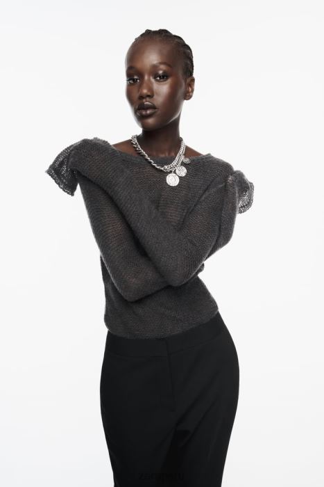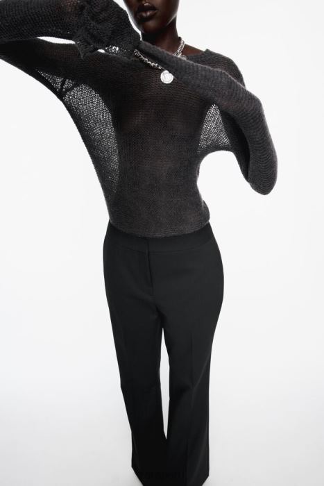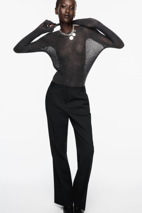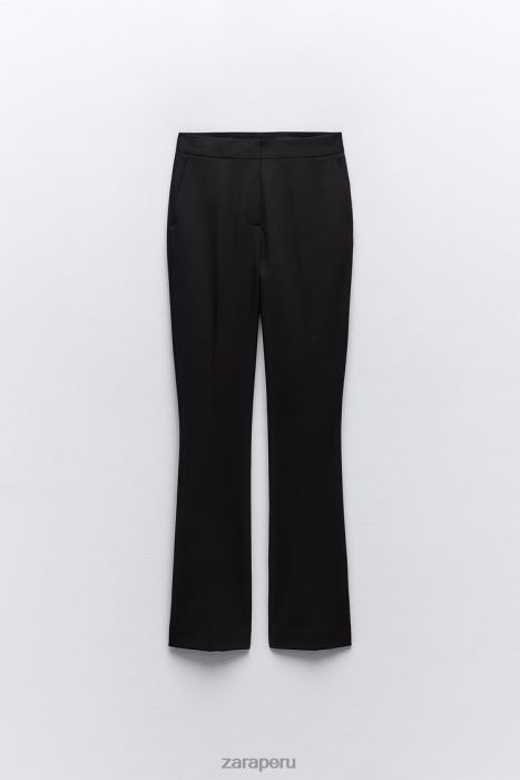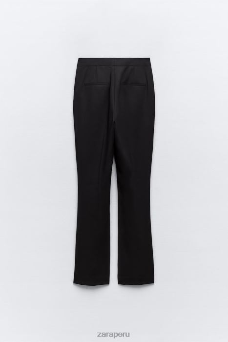 Pantalón de tiro alto con bolsillos delanteros y falsos bolsillos traseros de vivo. piernas acampanadas. Cremallera frontal, gancho metálico y cierre interior con botón.