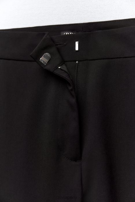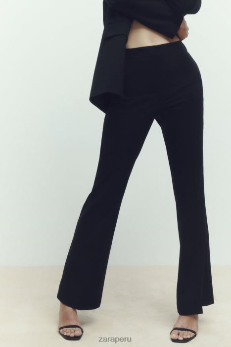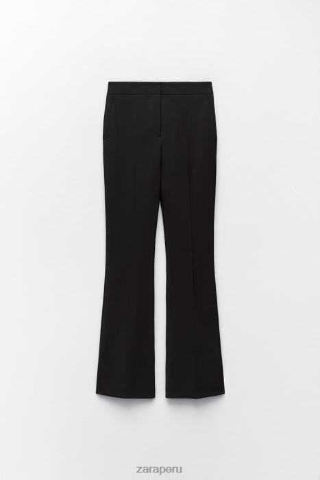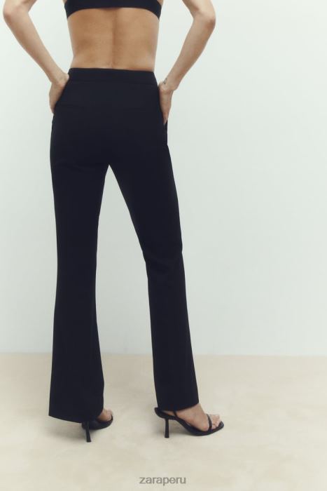 Pantalón de tiro alto con bolsillos delanteros y falsos bolsillos traseros de vivo. piernas acampanadas. Cremallera frontal, gancho metálico y cierre interior con botón.