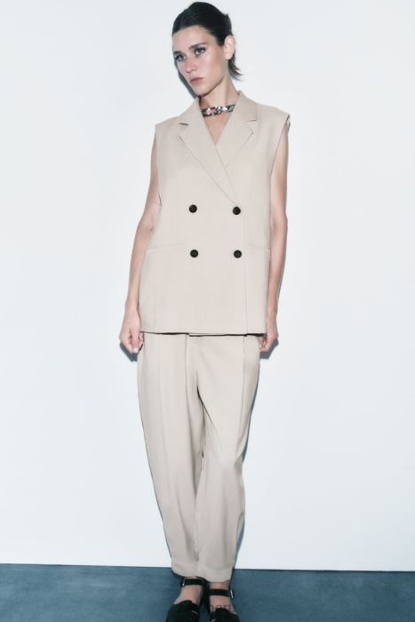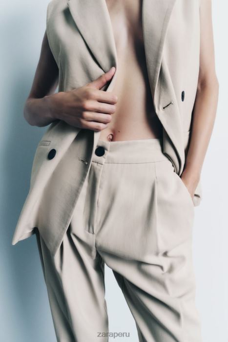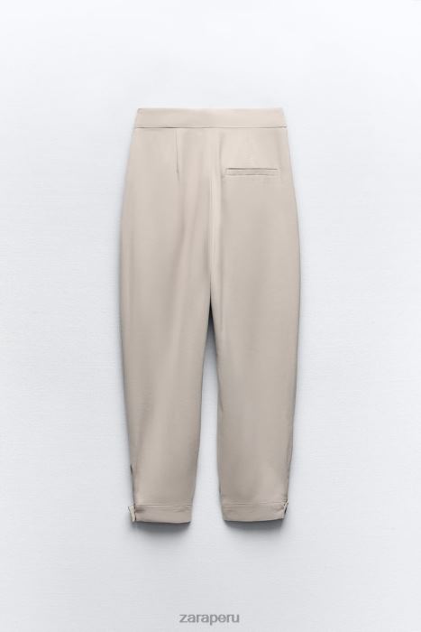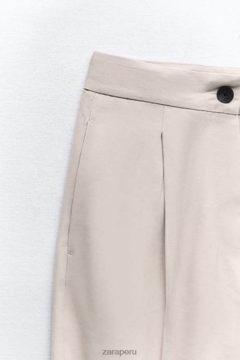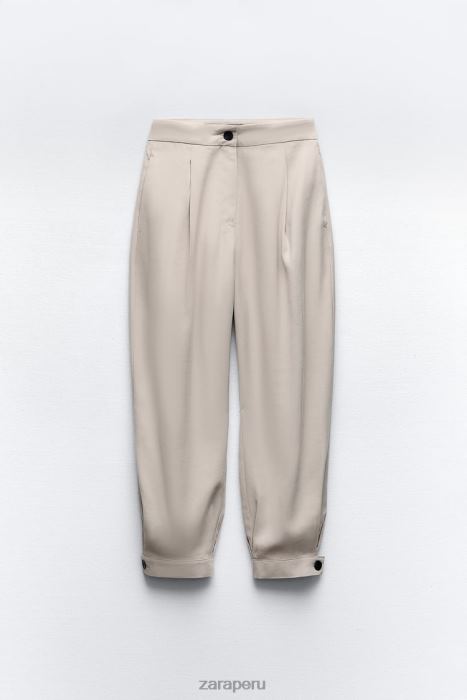Pantalón de tiro alto con pliegues delanteros. Bolsillos delanteros y falso bolsillo trasero de vivo. tirantes abotonados en el dobladillo. Cierre frontal con cremallera y botón.