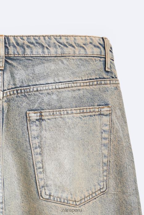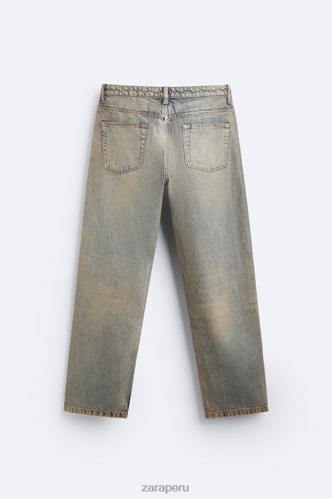 Jeans de corte recto confeccionados en tejido denim lavado con acabado metalizado irregular. cinco bolsillos. Cierre frontal con cremallera y botón.